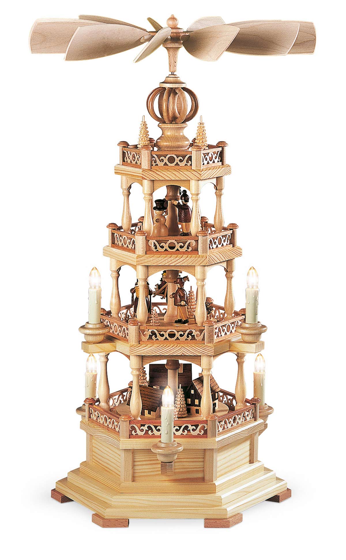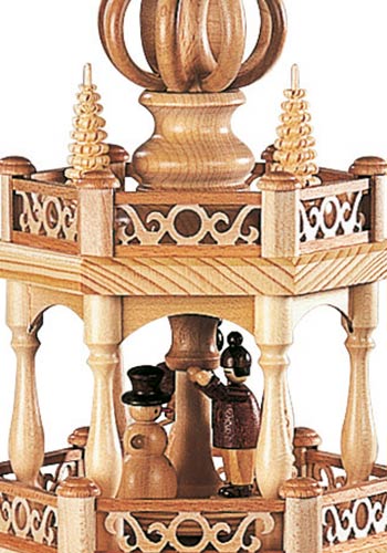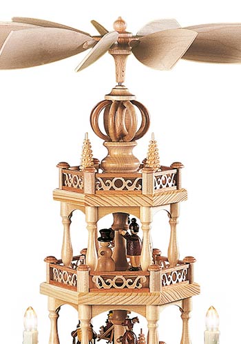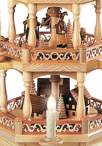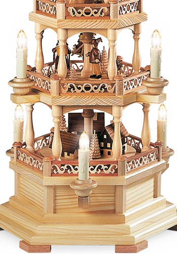 De onderste etage van deze schitterende piramide toont de typische huisjes die ook nu nog in het openluchtmuseum van Seiffen bewonderd kunnen worden. Het grootste huisje heeft een door water aangedreven draaiwerk waarmee de speelgoed dieren vervaardigd werden. Het huisje daarnaast is een armenhuis waar na de recessie in de mijnbouw vele families terecht kwamen. Het kleinste hutje op deze etage is een typische bergman woning. Dit alles is zeer gedetailleerd weergegeven. De middelste etage geeft een inzicht in het leven van die tijd. Hier ziet u een speelgoed bouwer met een verzameling hout uit het woud komt en een peperkoeken vrouwtje. Een andere bouwer van speelgoed is met zijn producten op weg naar de markt in Dresden. Op de bovenste etage is te zien hoe de kinderen zich gedurende de lange winters, die soms wel een half jaar duurden, bezig hielden met het bouwen van sneeuwpoppen en skieen. Gekroond wordt dit mooie kunstwerk met kleine ronde bogen bij de vleugel aanzet. Deze piramide wordt elektrisch aangedreven en verlicht.