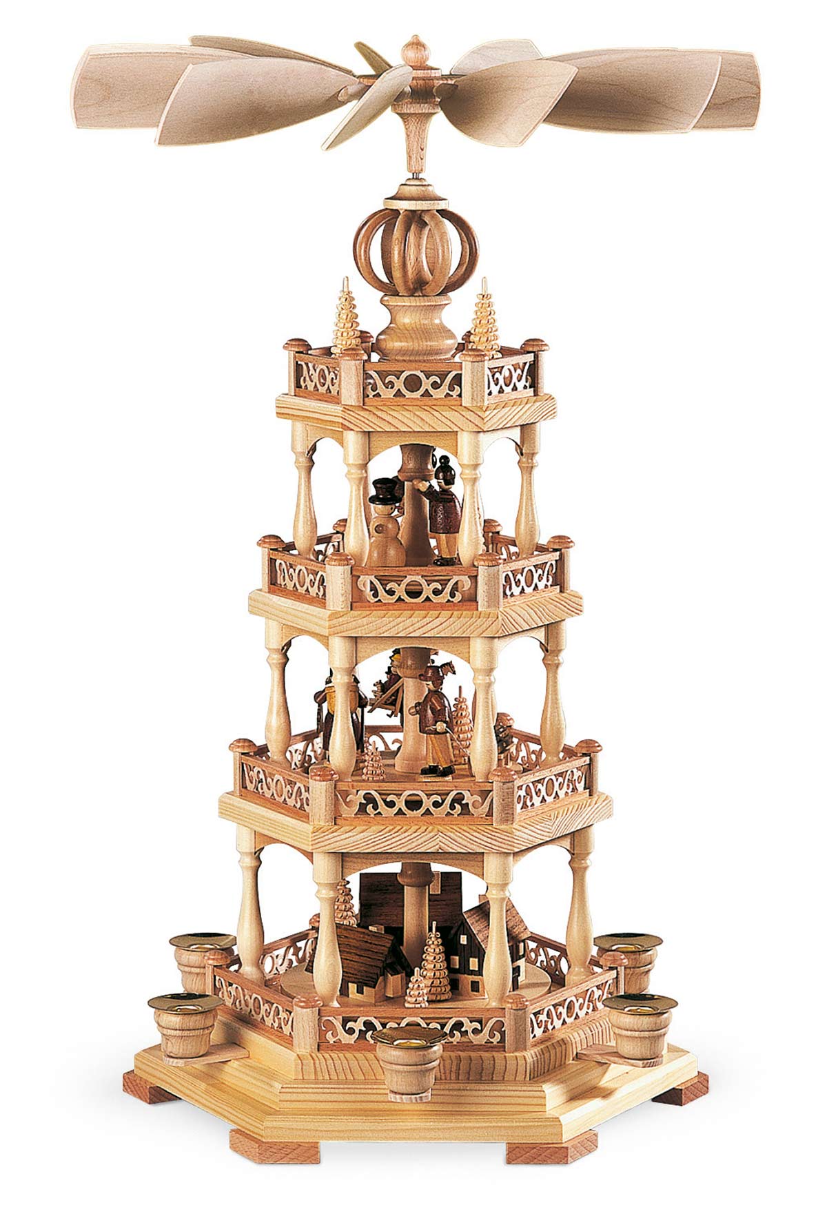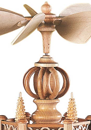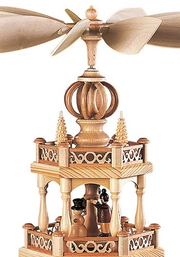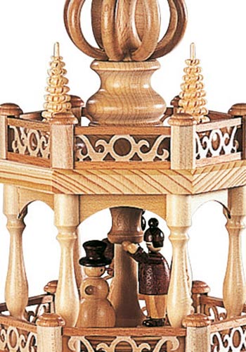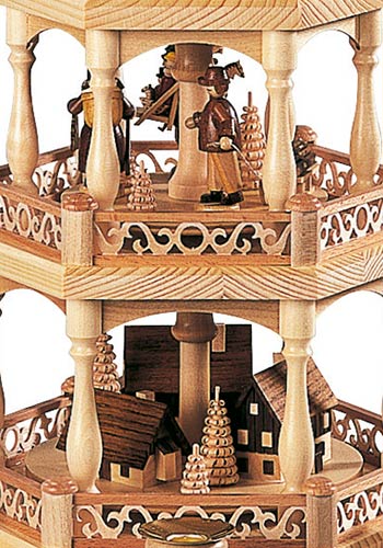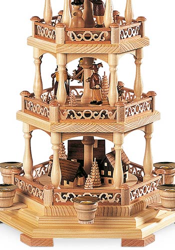 Op deze schitterende piramide van de firma Muller uit Seiffen wordt een verhaal verteld van het vroegere leven van de speelgoedmakers en handelaars uit het mooie Ertsgebergte. De onderste etage toont de typische huisjes die ook nu nog in het openluchtmuseum van Seiffen bewonderd kunnen worden. Het grootste huisje heeft een door water aangedreven draaiwerk waarmee de speelgoed dieren vervaardigd werden. Het huisje daarnaast is een armenhuis waar na de recessie in de mijnbouw vele families terecht kwamen. Het kleinste hutje op deze etage is een typische bergman woning. Dit alles is zeer gedetailleerd weergegeven. De middelste etage geeft een inzicht in het leven van die tijd. Hier ziet u een speelgoed bouwer met een verzameling hout uit het woud komt en een peperkoeken vrouwtje. Een andere bouwer van speelgoed is met zijn producten op weg naar de markt in Dresden. Op de bovenste etage is te zien hoe de kinderen zich gedurende de lange winters, die soms wel een half jaar duurden, bezig hielden. Sneeuwpoppen bouwen en skieën wordt ook tegenwoordig nog veel gedaan. De gestoken boompjes symboliseren de rijke natuur in het Ertsgebergte. Gekroond wordt dit mooie kunstwerk met kleine ronde bogen en drie gestoken spanboompjes. De piramide wordt aangedreven door zes piramide kaarsjes.