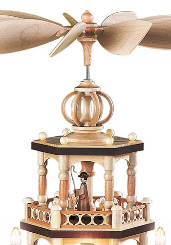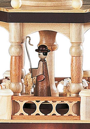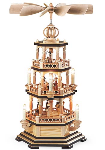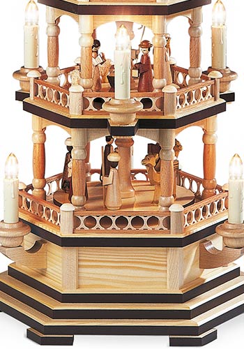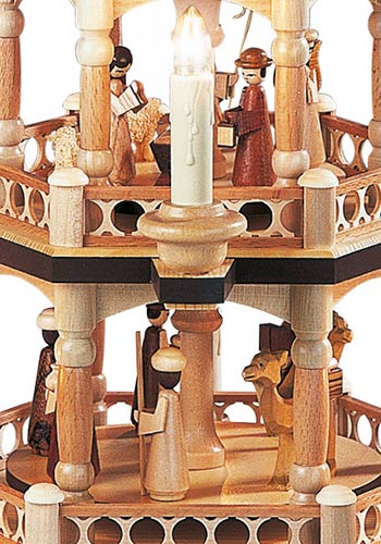 Dit meesterwerk van de firma Muller uit Seiffen toont op drie etages het kerstverhaal. Op de onderste etage stappen de met de hand gesneden kamelen achter hun drijvers en de drie koningen. Op de middelste etage bewaakt een engel Maria en Jozef die biddend naast de kribbe staan. Een herder met schapen bekijkt het tafereel van een afstandje. De ster van Bethlehem volgend komt een andere herder met zijn schapen op de bovenste etage aangelopen. Gekroond wordt dit mooie kunstwerk met kleine ronde bogen. De piramide wordt elektrisch aangedreven en verlicht.