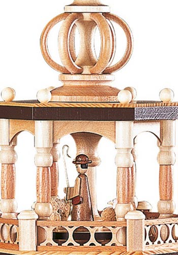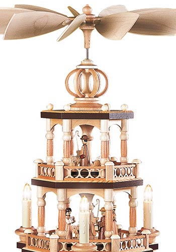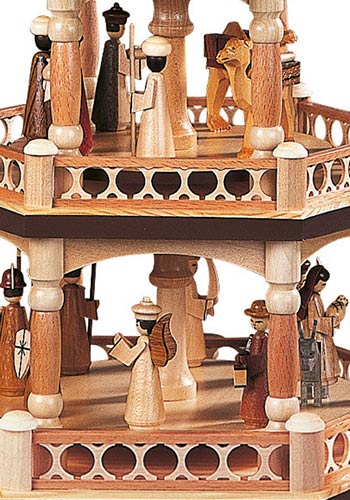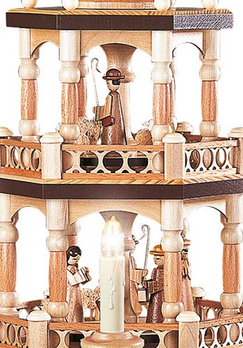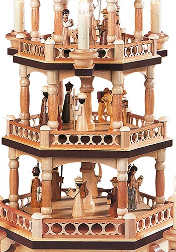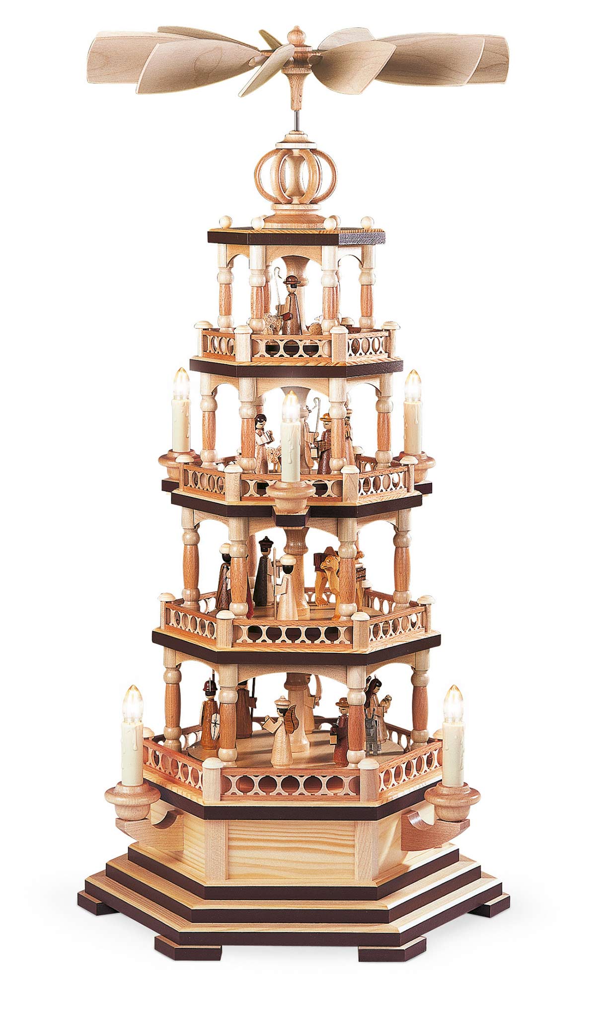 Deze wonderschone Kerstpiramide vertelt het kerstverhaal op vier etages. Op de onderste etage draagt een ezel Maria met haar kind op de arm, gevolgd door een groep bewapende soldaten. Ze wordt geleid door Jozef die met een lantaarn in de hand een engel volgt. Op de tweede etage volgen de drie heilige koningen met hun giften een kameel drijver gevolgd door twee hand gesneden kamelen. Daarboven staan nogmaals Maria en Jozef die zich biddend over de kribbe buigen. Een engel waakt over dit tafereel die bekeken wordt door een herder en zijn schapen. De fijne kleuren van deze piramide wordt verkregen door het gebruik van verschillende soorten hout. Zo wordt het kerstverhaal in deze piramide tot leven gebracht. De piramide wordt elektrisch verlicht en aangedreven.