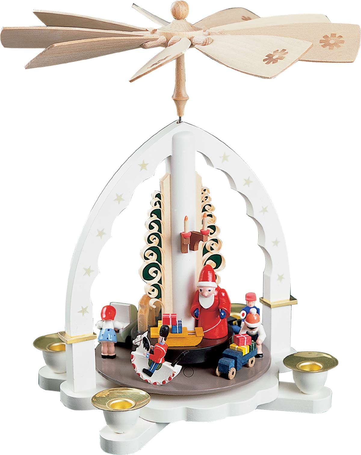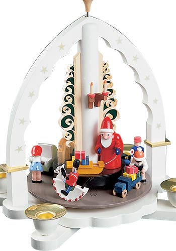 Een fraaie wit gekleurde piramide met kerstman en kado’s op 1 etage.